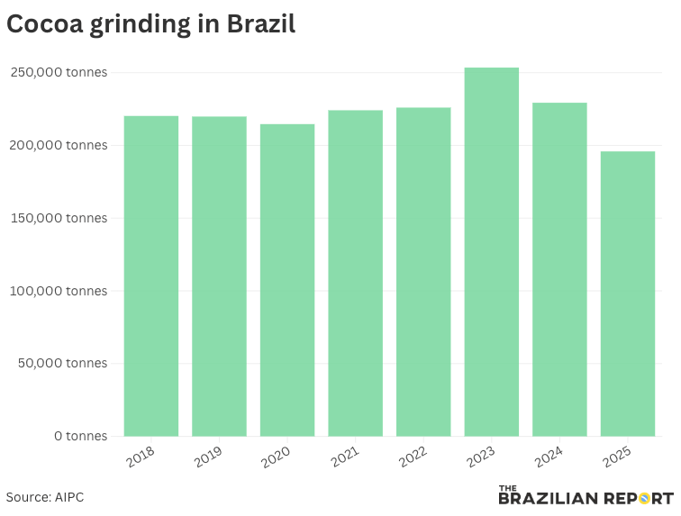 Brazil experienced a sharp decline in cocoa grinding in 2025, capping a difficult year for a sector that is still trying to rebuild after decades of setbacks.