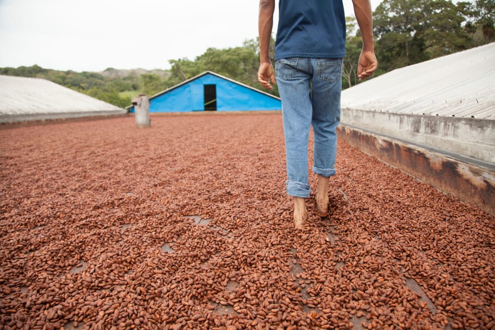 A worker walks across cocoa beans laid out to dry in a barge on a cocoa farm along Bahia’s Cacao Coast in southern Brazil. Photo: Caio Pederneiras/Shutterstock