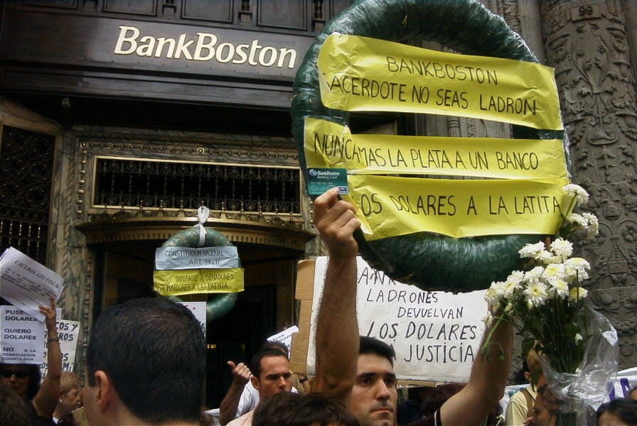 Argentine savers protested the corralito — the government’s freeze on bank withdrawals — outside BankBoston’s headquarters in Buenos Aires. Photo: Barcex/WikiCommons